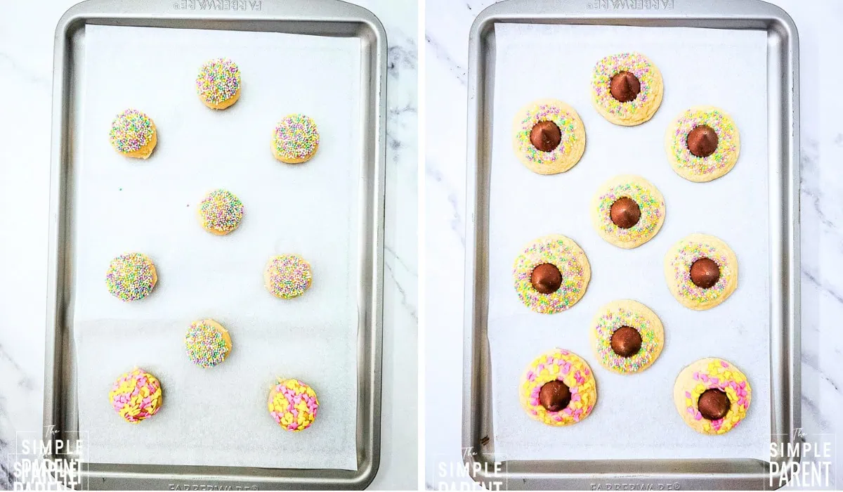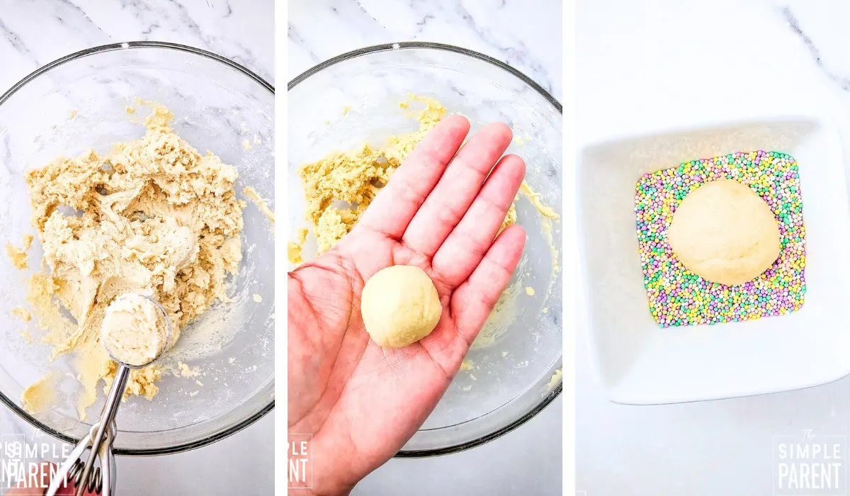 - Dip each dough ball into a bowl of sprinkles and place sprinkle-side up on the prepared baking sheet, spacing them about 2 inches apart.
