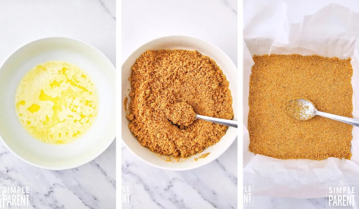 - Mix together the graham cracker crumbs and melted butter, then press the mixture into the prepared baking dish in an even layer.