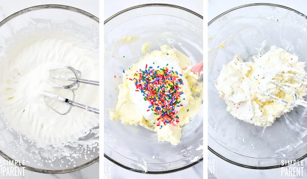 - Fold the sprinkles in gently and quickly. The longer you mix, the more the colors will start to bleed into the filling.