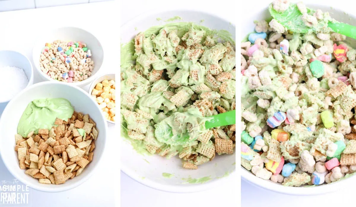 - Mix green candy melts with chex mix and powdered sugar in a ziplock bag. Careful not to break cereal. Add in lucky charms cereal and mix well.