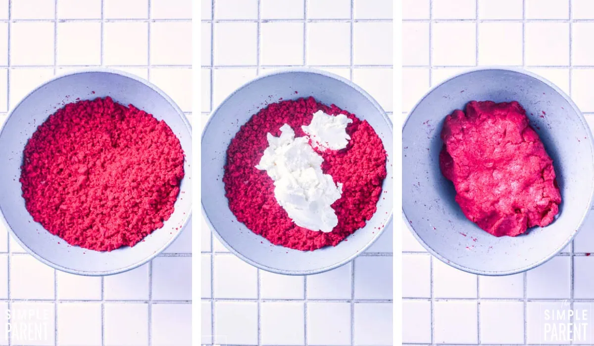 What if my mixture is too crumbly and wonโt hold together? Add more cream cheese frosting, one tablespoon at a time, until the mixture holds its shape when you press it into a ball. The texture should be like Play-Doh.