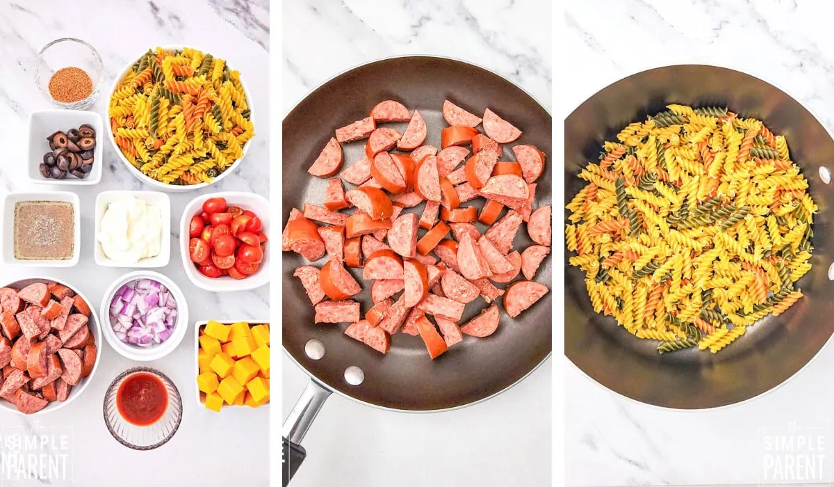 Step 1. Cut the sausage into ยฝ inch slices, then cut the slices in half (so you have a half moon). Add them to a skillet and sprinkle the barbecue seasoning over the meat. Cook over medium heat, tossing as it heats while the noodles cook.