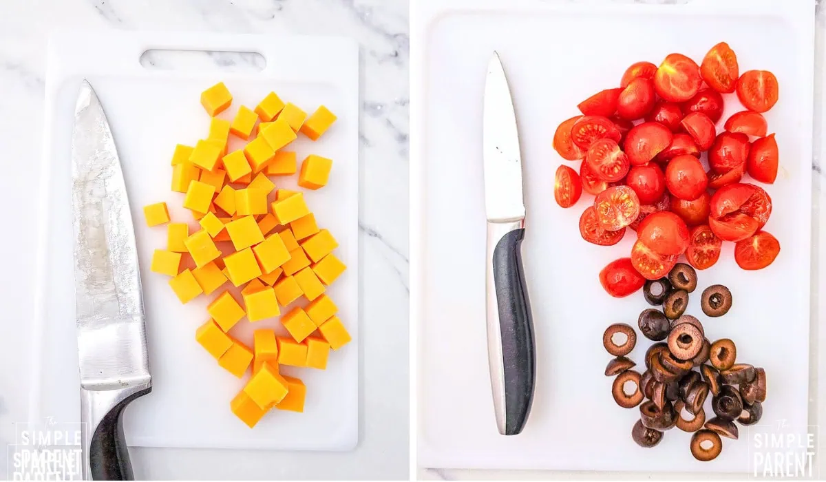- Cut the tomatoes, onion, olives, and cheese.
