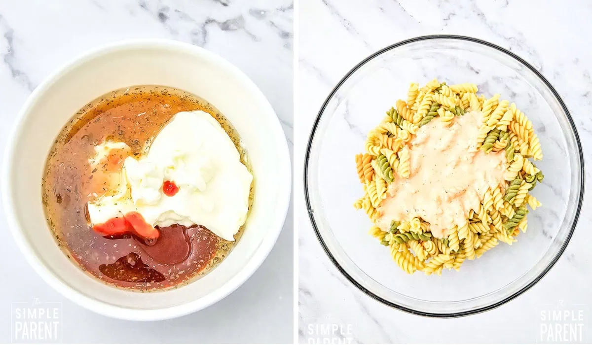 - Mix the mayonnaise, Italian dressing and sriracha together in a small bowl and pour over the noodles. Stir well to coat the noodles.