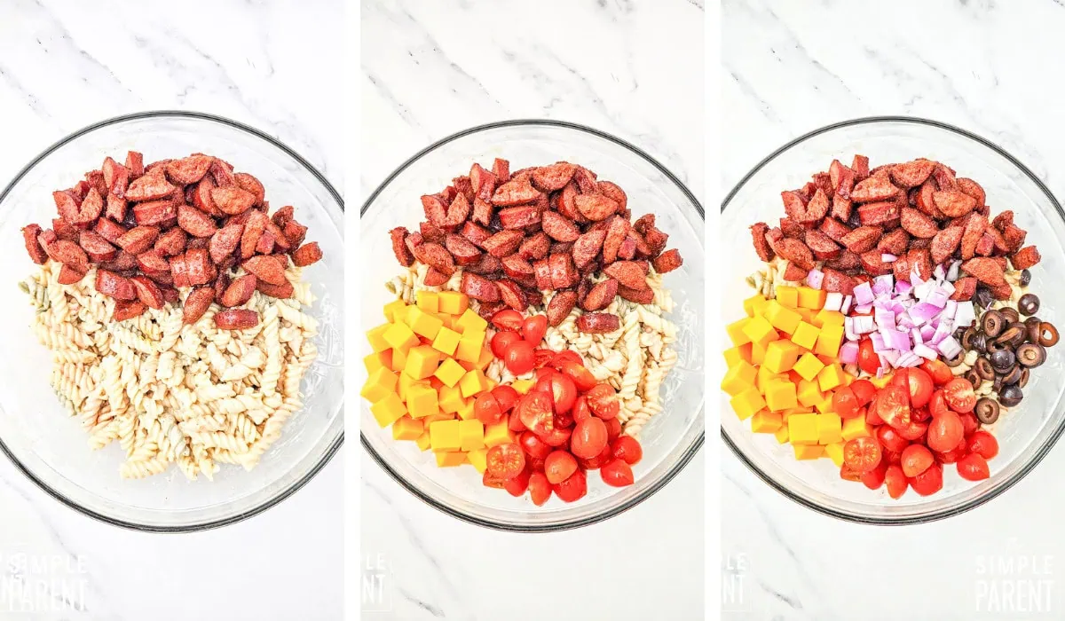 - Use a different sausage: Andouille sausage, kielbasa, or chicken sausage all work well if you want to switch up the flavor. Summer sausage is another great option for a pasta salad with sausage.