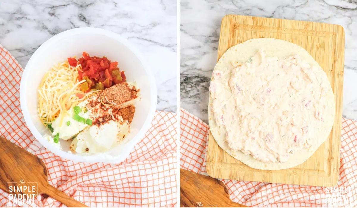 Step 2. Spread a thin layer of the filling mixture over the top of each tortilla.