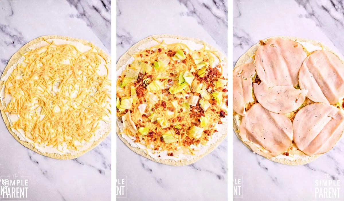 - Sprinkle each tortilla with cheese, then bacon pieces, then lettuce. Top with turkey slices.