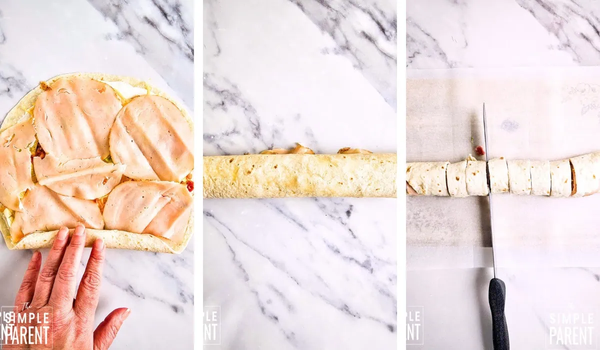 - Roll the tortillas as tightly as possible without tearing them so the pinwheels hold their shape when sliced