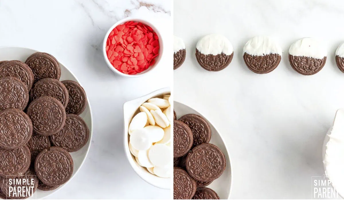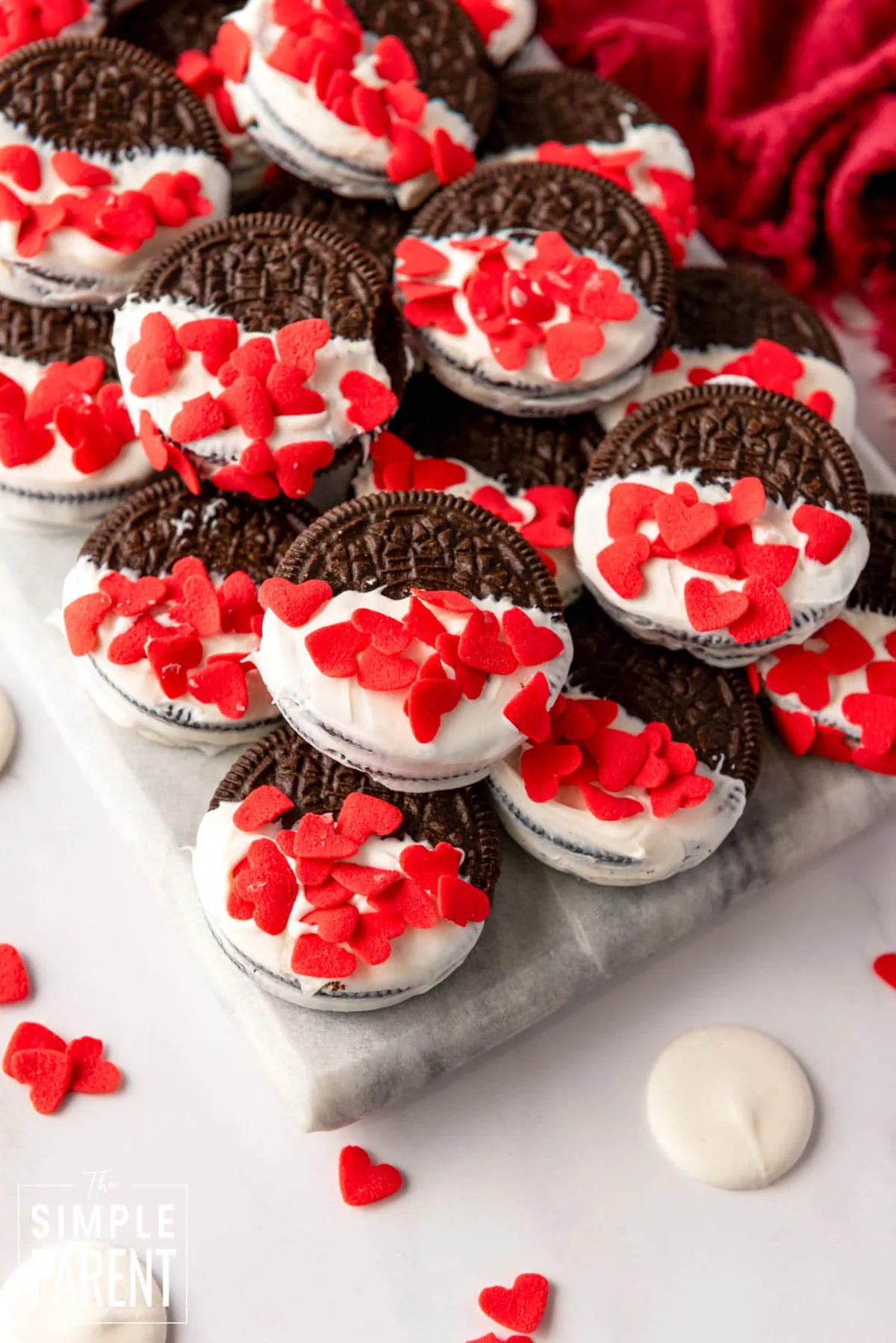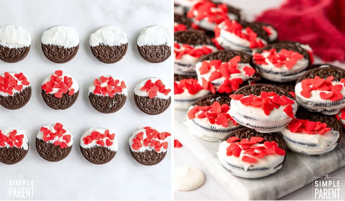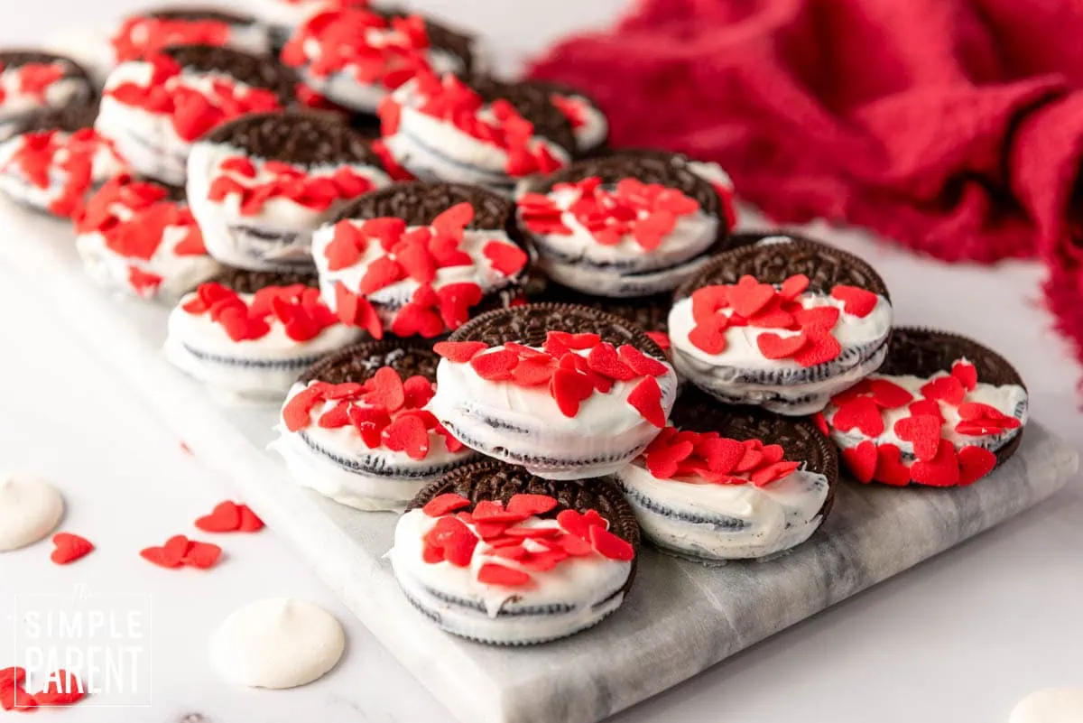 Valentine Oreos are the easiest decorated Oreos youโll ever make and they look absolutely adorable for Valentineโs Day. These white chocolate covered Oreos take just 25 minutes from start to finish, and all you need is a package of cookies, white candy melts, and festive sprinkles.
